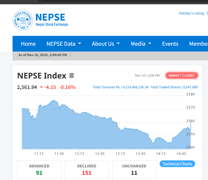 कारोबारसँगै घट्यो सेयर बजार, नेप्से परिसूचक २५६० कायम