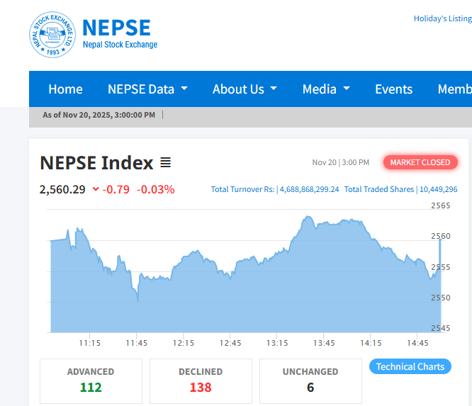काठमाडौं,४ मंसिर । साताको अन्तिम सेयर कारोबार दिन बिहीबार नेप्से परिसूचक सामान्य अंकले घटेर बन्द भएको छ । आज नेप्से परिसूचक ०.९३ अंकले घटेर २५६०.१५ विन्दुमा कायम भएको हो ।
