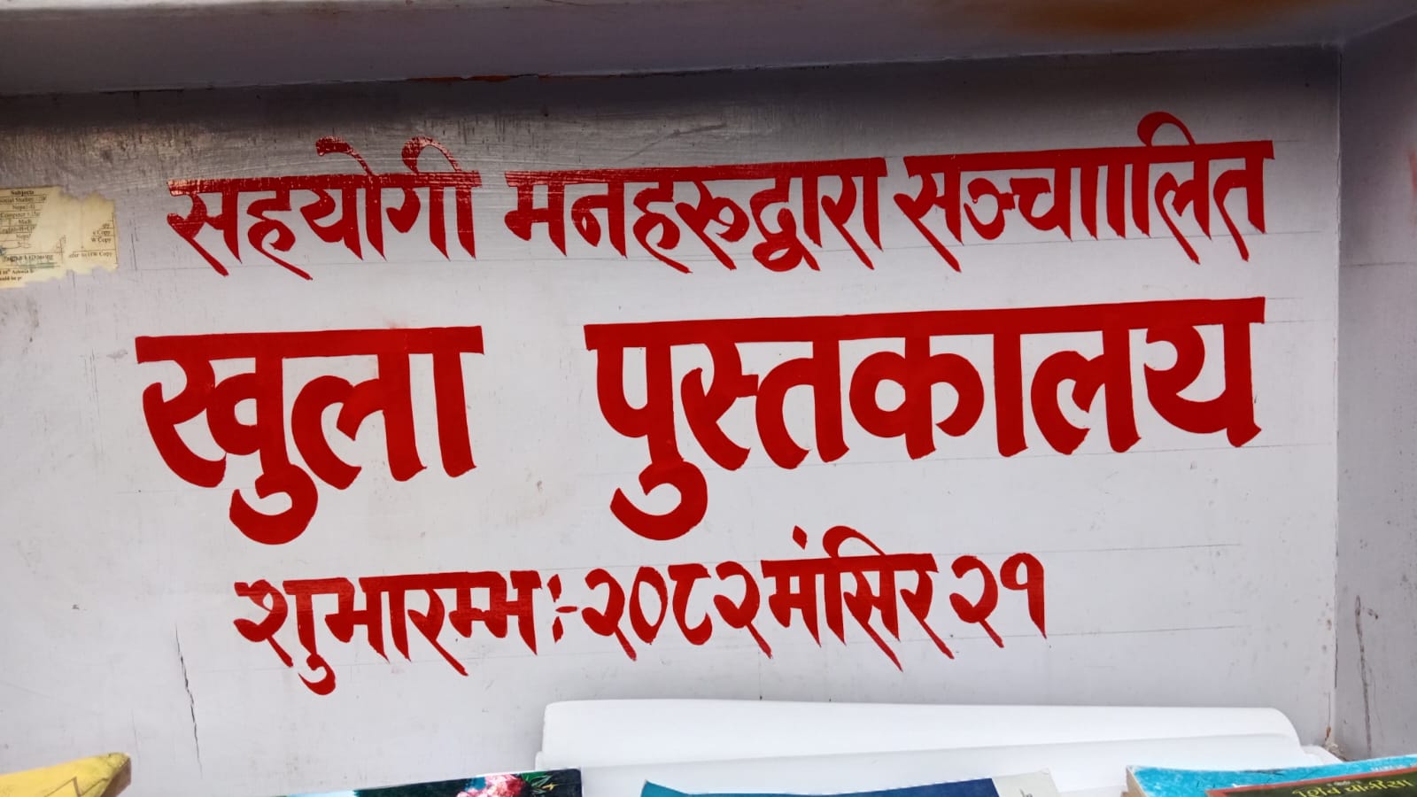 आजदेखि सुरुवात भएको छ, यसलाई व्यवस्थित गर्दै लैजाने योजना छ, उनले भने, ‘पढ्न योग्य भएका आ आफ्नो घरमा थन्किएर बसेका किताबहरु यस पुस्तकालयमा हस्तान्तरण गर्न आग्रह गर्दछु ।’ स्वाध्यायनले व्यक्तिको ज्ञानमा निखार र आचरणमा परिवर्तन ल्याउने भएकाले ज्ञानको वृद्धि र निखारताका लागि उपयुक्त स्थान नै पुस्तकालय भएको उनले बताए । यस पुस्तकालय सहयोगी मनहरुद्वारा सञ्चालित हुनेसमेत उनले बताए ।