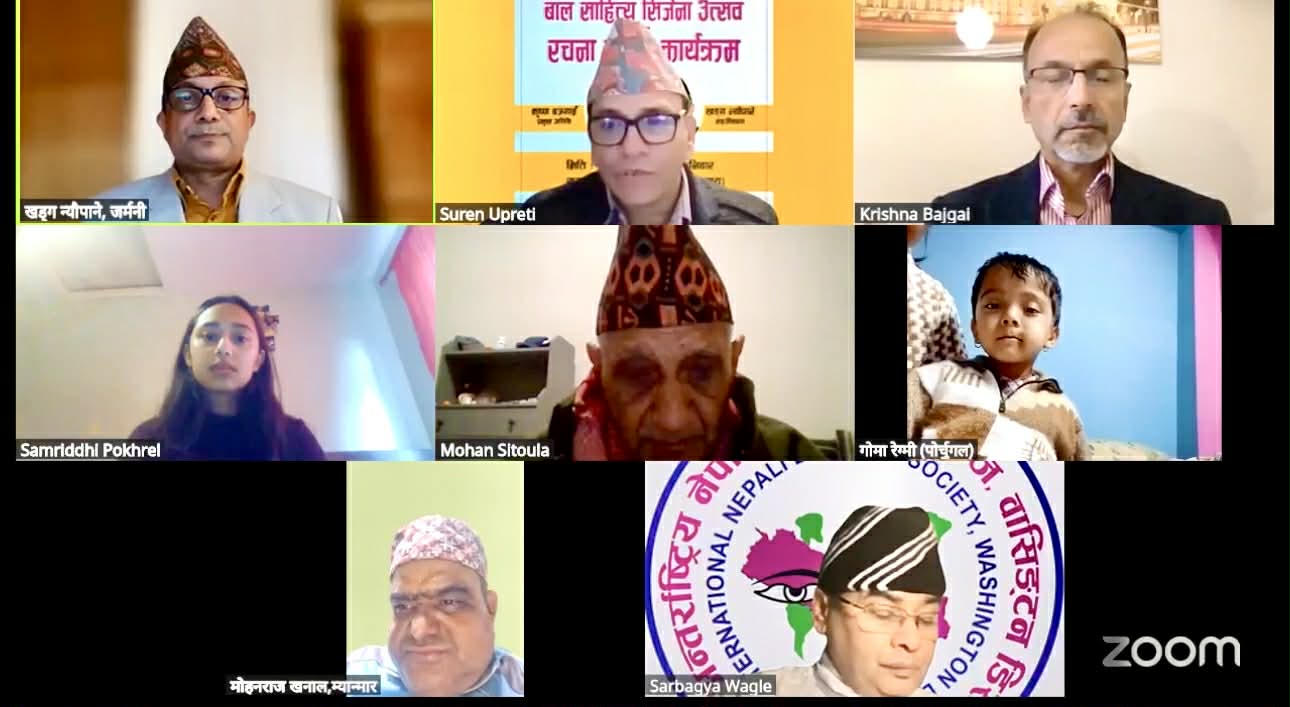 काठमाडौँ । अन्तरराष्ट्रिय नेपाली साहित्य समाज (अनेसास) ले शनिबार (६ डिसेम्बर) भर्चुअल माध्यममार्फत चौथो हजुरबा–हजुरआमा दिवस’ एवं बाल साहित्य सिर्जना उत्सव र रचना वाचन कार्यक्रम सम्पन्न गरेको छ। विश्वभरका स्रष्टा, शिक्षक, बालबालिका र समीक्षकहरुको सहभागिता रहेको उक्त कार्यक्रममा भाषा, साहित्य र संस्कृतिको संरक्षण तथा पुस्तान्तरणका विषयमा गम्भीर छलफल तथा विविध प्रस्तुति गरियो।
