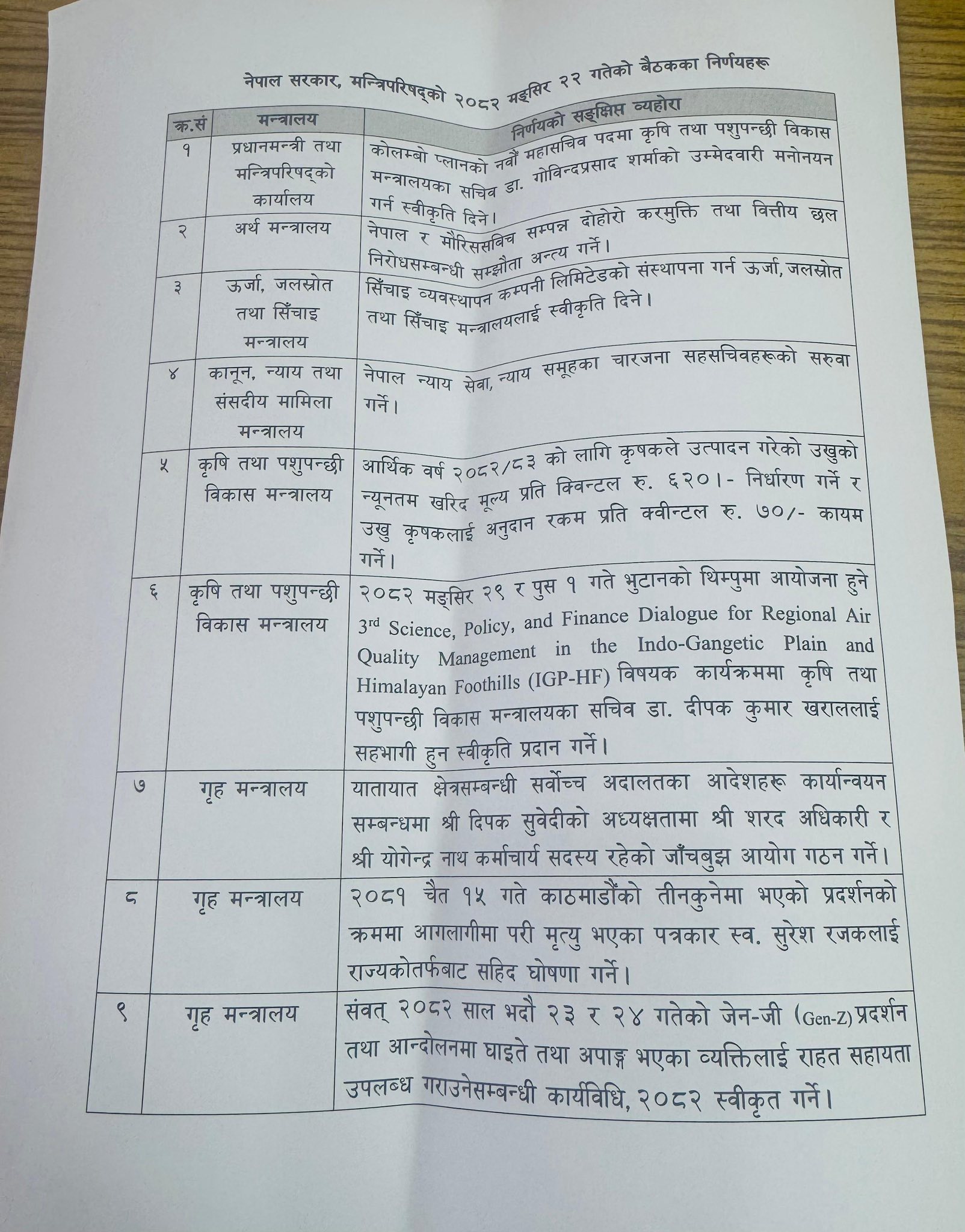 उनका अनुसार, आर्थिक कार्यविधि तथा वित्तीय उत्तरदायित्व ९दोस्रो संशोधन० नियमावली, २०८२ स्वीकृत, कोलोम्बो प्लानको नवौं महासचिव पदमा कृषि मन्त्रालयका सचिव डा। गोविन्दप्रसाद शर्माको उम्मेदवारी स्वीकृत, तीनकुने घटनामा ज्यान गुमाएका सुरेश रजकलाई शहीद घोषणा लगायतका निर्णय गरेको छ ।
