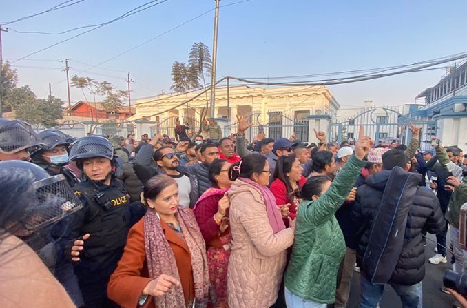 देउवा नेतृत्वको कांग्रेसको तर्फबाट तरुण दल अध्यक्ष विद्वान गुरुङसहित युवाहरू निर्वाचन कार्यालयअगाडि धर्ना दिँदै नाराबाजी गरिरहेका छन् ।