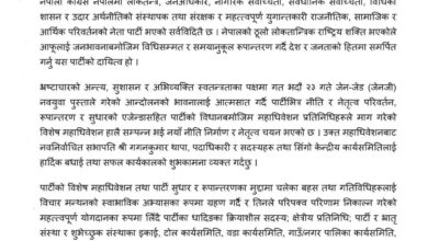 लोकतान्त्रिक राष्ट्रशक्तिको रूपमा कांग्रेसले आफूलाई जनभावना अनुकूल विधिसम्मत र समयानुकूल रूपान्तरण गर्दै देश र जनताको हितमा समर्पित हुनुपर्ने दायित्व रहेको विज्ञप्तिमा जनाइएको छ ।