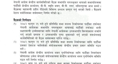 ९१० २०८२ फागुन २१ गते हुने प्रतिनिधि सभा सदस्य निर्वाचनमा पार्टीका तर्फबाट नेपाली कांग्रेसका सभापति गगनकुमार थापालाई पार्टीको तर्फबाट भावी प्रधानमन्त्री उम्मेदवारका लागि नेपाली कांग्रेसका उपसभापति विश्वप्रकाश शर्माले गर्नु भएको प्रस्ताव र उपसभापति पुष्पा भुसालको गर्नुभएको समर्थनलाई कार्यसमितिको यो बैठक सर्वसम्मत पारित गर्दछ ।