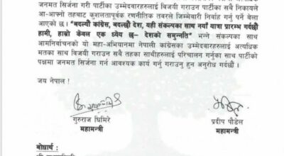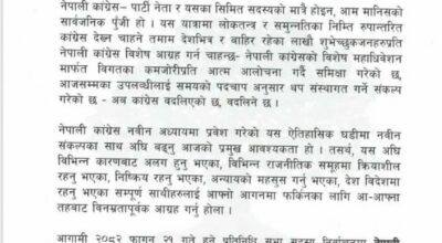 ुगत भाद्र २३ र २४ गते जेनजी पुस्ताद्वारा भएको प्रदर्शन पछि परिवर्तित राजनीति परिस्थितको यस कठिन र संवेदनशील घडीमा हामी सबैको उच्च मनोबल, एकता र जिम्मेवारीपूर्ण प्रतिबद्धताका साथ अघि बढ्न अत्यावश्यक छ । यो निर्वाचनमा नेपाली कांग्रेसको पक्षमा अत्यधिक जनमत सिर्जना गरी पार्टीका उम्मेदवारहरूलाई विजयी गराउन पार्टीका सबै निकायले आ(आफ्नो तहबाट कुशलतापूर्वक रणनीतिक तवरले जिम्मेवारी निर्वाह गर्नु पर्ने बेला आएको छु परिपत्रमा भनिएको छ ।