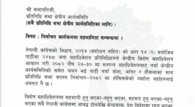कांग्रेसले ७७ वटै जिल्ला सभापति र क्षेत्रीय कार्यसमितिलाई सम्बोधन गर्दै परिपत्र जारी, खोजे देउवाको साथ