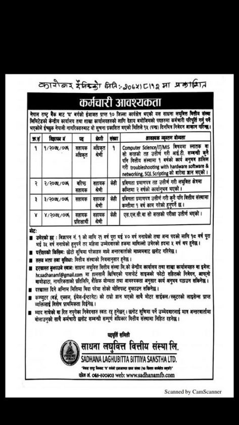 १० जिल्ला कार्यक्षेत्र भएको साधना लघुबित्त बित्तीय संस्थाले कार्तिक मसान्त सम्ममा २५ बटा शाखा कार्यालयबाट १६०११ घर परिवारलाई वित्तीय सेवा प्रवाह गरिरहेको छ ।