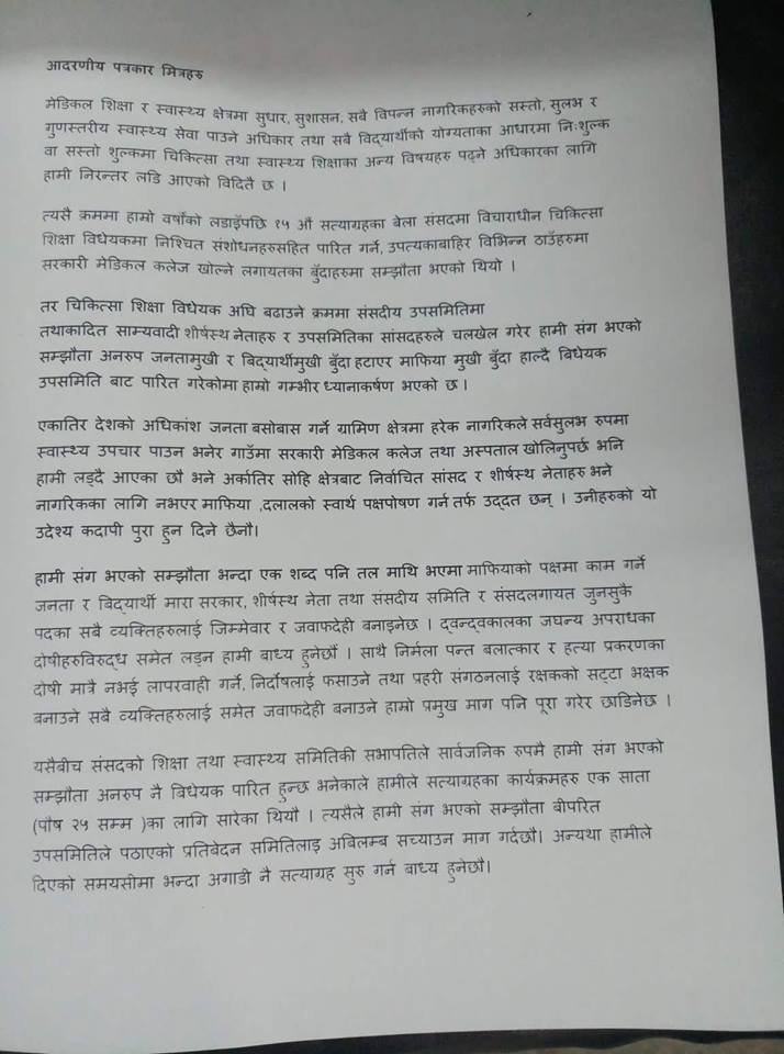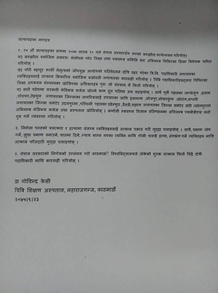 डा। केसीले सोमबार पत्रकार सम्मेलन गर्दै आफ्नो १५ औँ सत्याग्रहका बेला संसदमा विचाराधिन चिकित्सा शिक्षा विधेयक निश्चित संशोधनसहित पारित गर्ने, उपत्यका बाहिर विभिन्न ठाउहरुमा सरकारी मेडिकल कलेजहरु खोल्नेलगायतका सहमतिविपरित विधेयक पारित गरेकोमा आपत्ति जनाएका हुन् ।