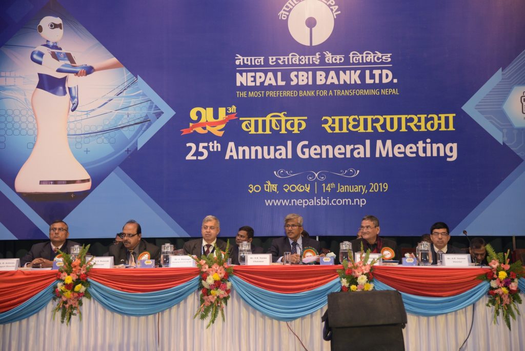 काठमाडौं, ३० पुस । नेपाल एसबिआई बैंक लि.को २५औँ वार्षिक साधारणसभा सम्पन्न भएको छ । सभाले बैंकका शेयरधनीहरुलाई चुक्ता पूँजीमा १५.७९ प्रतिशतका दरले लाभांश (५%वोनश शेयर र १०.७९% नगद लाभांश) वितरण गर्ने प्रस्ताव पारित गरेको छ ।
