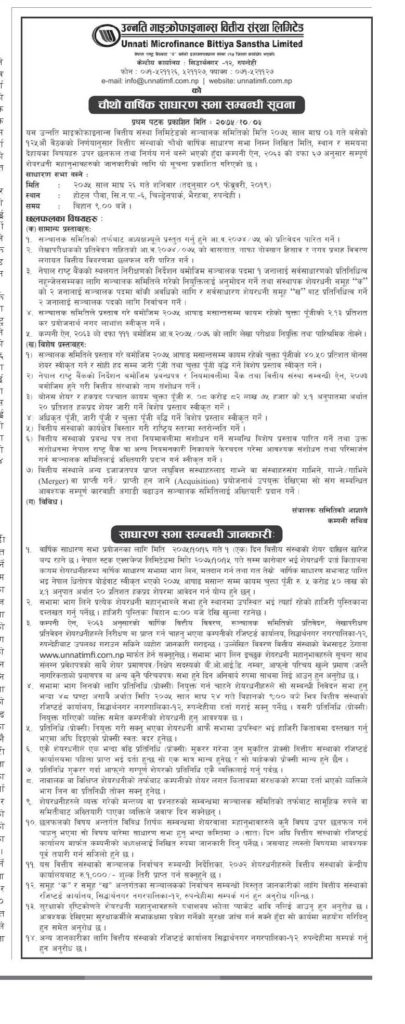काठमाडौं, ५ माघ । उन्नती माइक्रोफाइनान्सले माघ २६ गते चौथो वार्षिक साधारणसभा डाकेको छ । संस्थाले माघ १५ गतेसम्म कायम शेयरधनीहरुको लागि चुक्ता पूँजी ५ करोड ५० लाख रुपैयाँको २० प्रतिशत हकप्रद शेयर र ४०.५ प्रतिशत बोनस शेयर पाउने भएका छन् ।