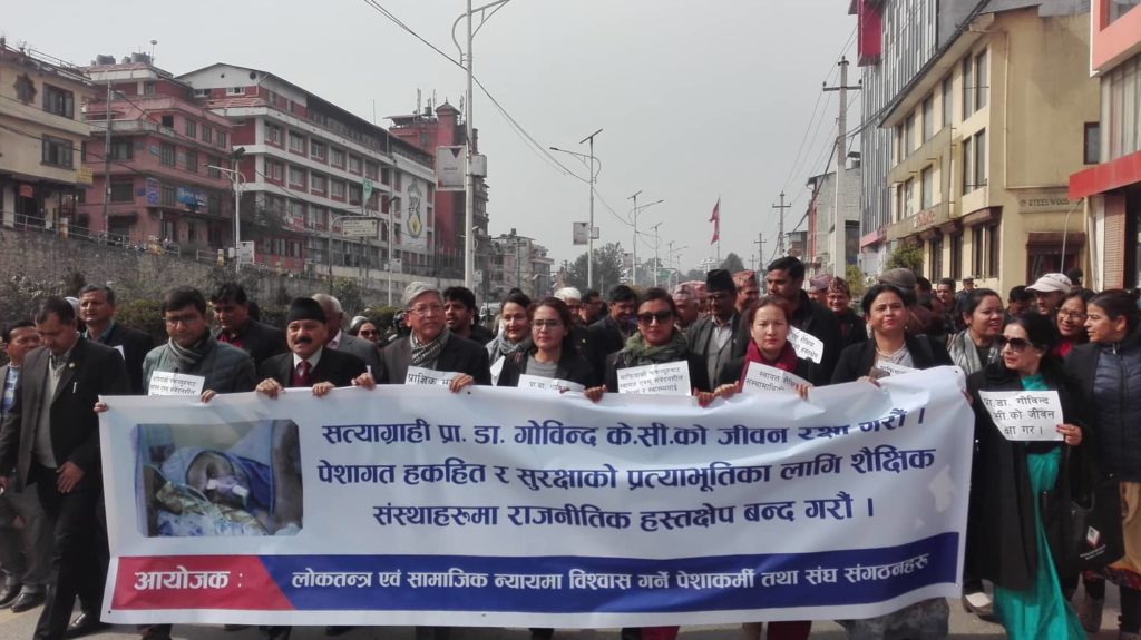 काठमाडौं,माघ १७ । लोकतन्त्रवादी पेशागत संघसंगठनसँग आबद्ध बुद्धिजीविहरुले चिकित्सा शिक्षा क्षेत्रको सुधारको माग सहित अनसनरत डा गोविन्द केसीको मागमा ऐक्यबद्धता जनाउँदै बिहिबार राजधानीमा बृहत प्रदर्शन गरेका छन ।