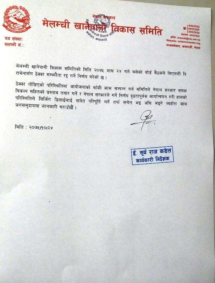 मेलम्ची खानेपानी आयोजना प्रमुख सुर्यराज कँडेले भने, “कम्पनीसंगको वार्ता असफल भएको, कम्पनीले काममा फर्कन चासो नदिएको, र आयोजनाले सोधेको जवाफ पनि नदिएको हुँदा ठेक्का तोडेको बताए ।”