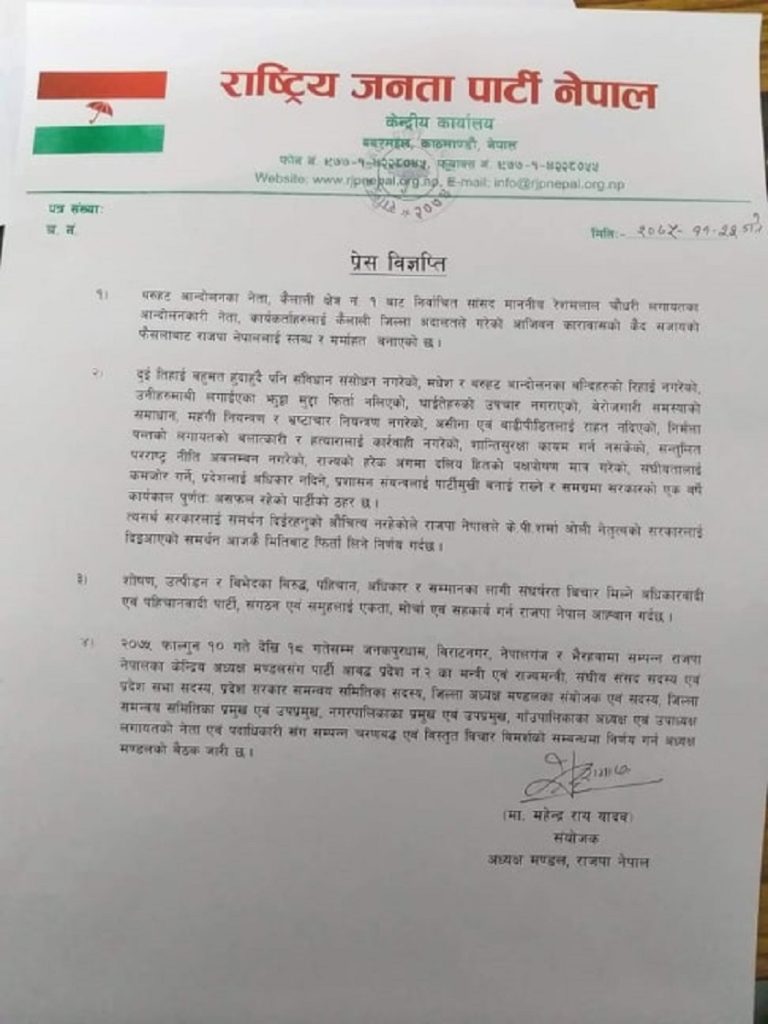 राजपाले सरकारलाई दिएको समर्थन फिर्ता लियो (विज्ञप्ति सहित)