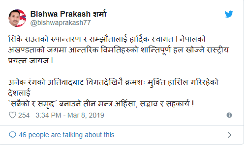 कांग्रेस प्रवक्ता विश्वप्रकाश शर्माले ट्वीट गर्दै सिके राउतको रुपान्तरण र सम्झौता स्वागतयोग्य भएको बताएका हुन्।