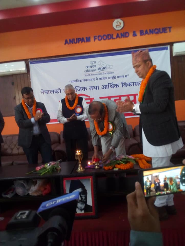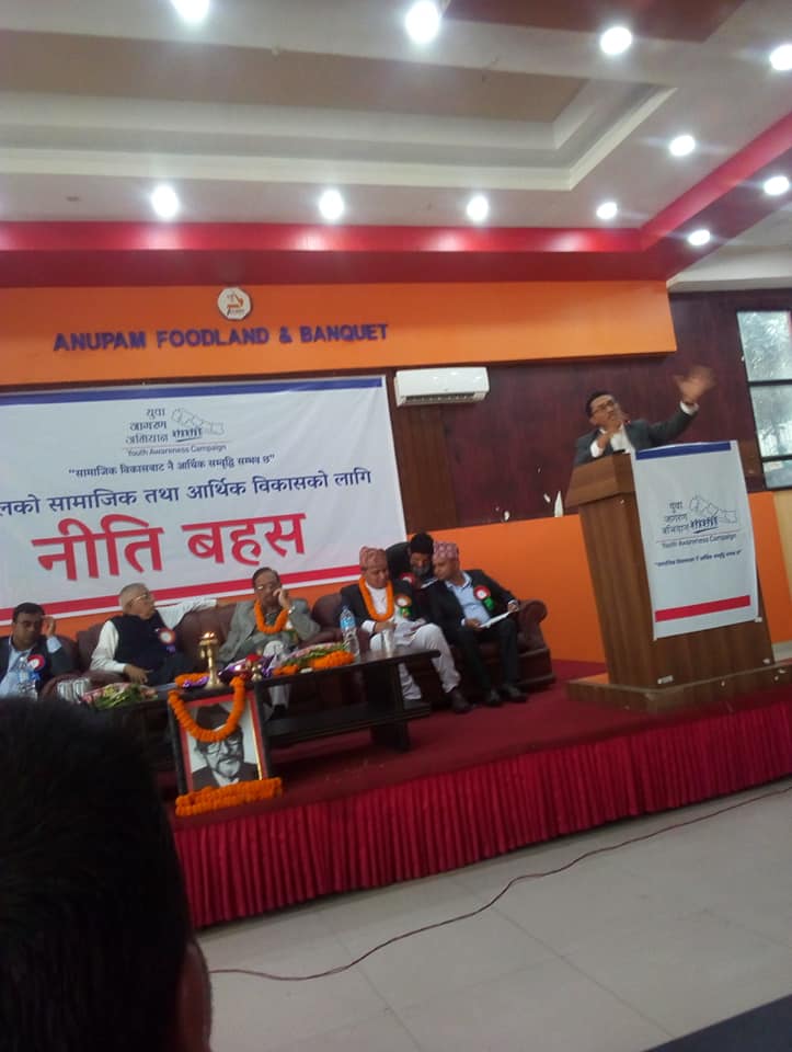 राष्ट्रिय योजना आयोगका पूर्वउपाध्यक्ष तथा अर्थविद् डा. स्वर्णिम वाग्लेले युवालाई जागरुक बनाए मात्र मुलुकको विकास सम्भव हुने बताउँदै मुलुकको विकासका लागि उद्योगमैत्री वातावरण निर्माण पहिलो आवश्यकता भएको बताए । आर्थिक सम्वृद्धिको लागि सबै स्रोत र साधानलाई उपयोग गरी आर्थिक उन्नती नै अन्तिमअस्र भएका बताए ।