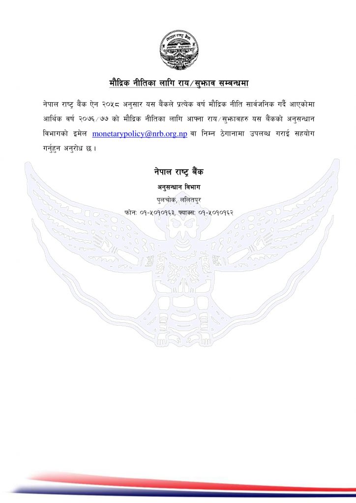प्रवक्ता निरौलाले मौद्रिक नीतिको केही तयारी अझै बाँकी रहेकाले मौद्रिक नीति आउन समय लाग्ने र राष्ट्र बैंकले सरोकारवालासँग सुझाव लिने क्रम जारी रोखेको बताए । केन्द्रीय बैंकले सरोकारवालालाई सार्वजनिक छलफलमा बोलाएर सुझाव पछि अन्तिममा मौद्रिक नीति सार्वजनिक हुने उनले बताए ।