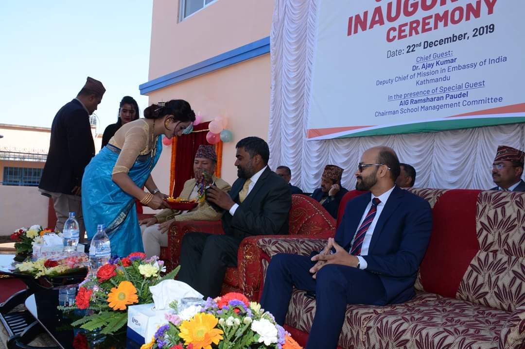 यस अघि उक्त भवनको लागि भारतीय राजदुतावासद्धारा विद्यालयलाई रु ४,८६,३४,५६४ (चार करोड छ्यासी लाख चौतिस हजार पाँच समय चौसठ्ठी), सहयोग भई भवन निर्माण को शिलान्यास मिति २०७१ साल आषाढ २७ गते तत्कालिन महामहिम भारतीय रातदूत रणजित रायज्यूबाट सु–सम्पन्न भएको थियो । भवनको भौतिक संरचना निर्माण सम्पन्न पश्चात पुस ६ गतेका दिन भारतीय राजदुतावासका विशेष प्रतिनिधि डिपुटी चिफ अफ मिसन डा. अजय कुमारले विधिवत् रुपमा समुद्घाटन गर्नु भएको हो ।