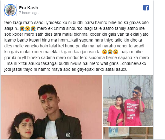 आफ्नो जिन्दगीको नयाँ अध्याय शुरू गर्न नपाउँदै रमिताले संसार छाडिन् । आफैंले बाँडेका कार्डका निम्तालुलाई विवाह समारोहमा सहभागी हुने अवसर दिन पनि पाइनन् ।रमिताले छाडेर गएपछि प्रकाश भावविह्वल छन् । उनले फेसबूकमा मर्मस्पर्शी स्टाटस लेखेका छन् ।