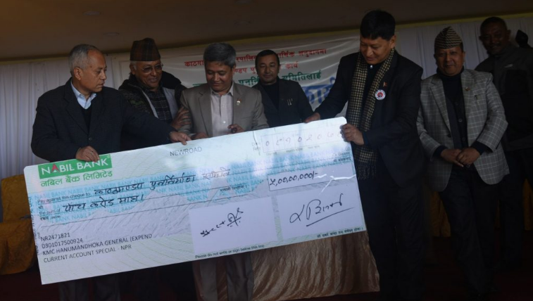 बिहीबार एक कार्यक्रामबीच महानगरपालिका मेयर विद्यासुन्दर शाक्यले काष्ठमण्डप पुनर्निर्माण समितिका अध्यक्ष राजेशकाजी शाक्यलाई ५ करोड रुपैयाँको चेक प्रदान गरेका हुन् ।