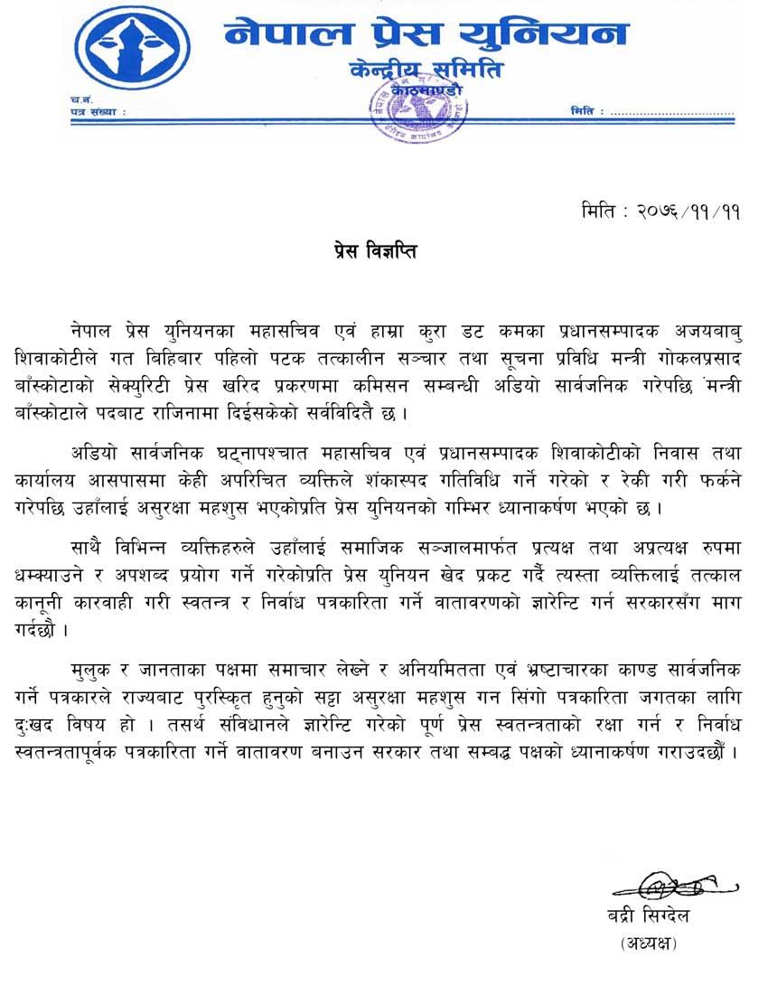 गत विहीबार पहिलो पटक तत्कालीन सञ्चार तथा सूचना प्रविधि मन्त्री गोकलप्रसाद बाँस्कोटाको सेक्युरिटी प्रेस खरिद प्रकरणमा कमिसन सम्बन्धी अडियो सार्वजनिक गरेपछि उनीमाथि सुरक्षा थ्रेट बढेको युनियनको दावी छ ।