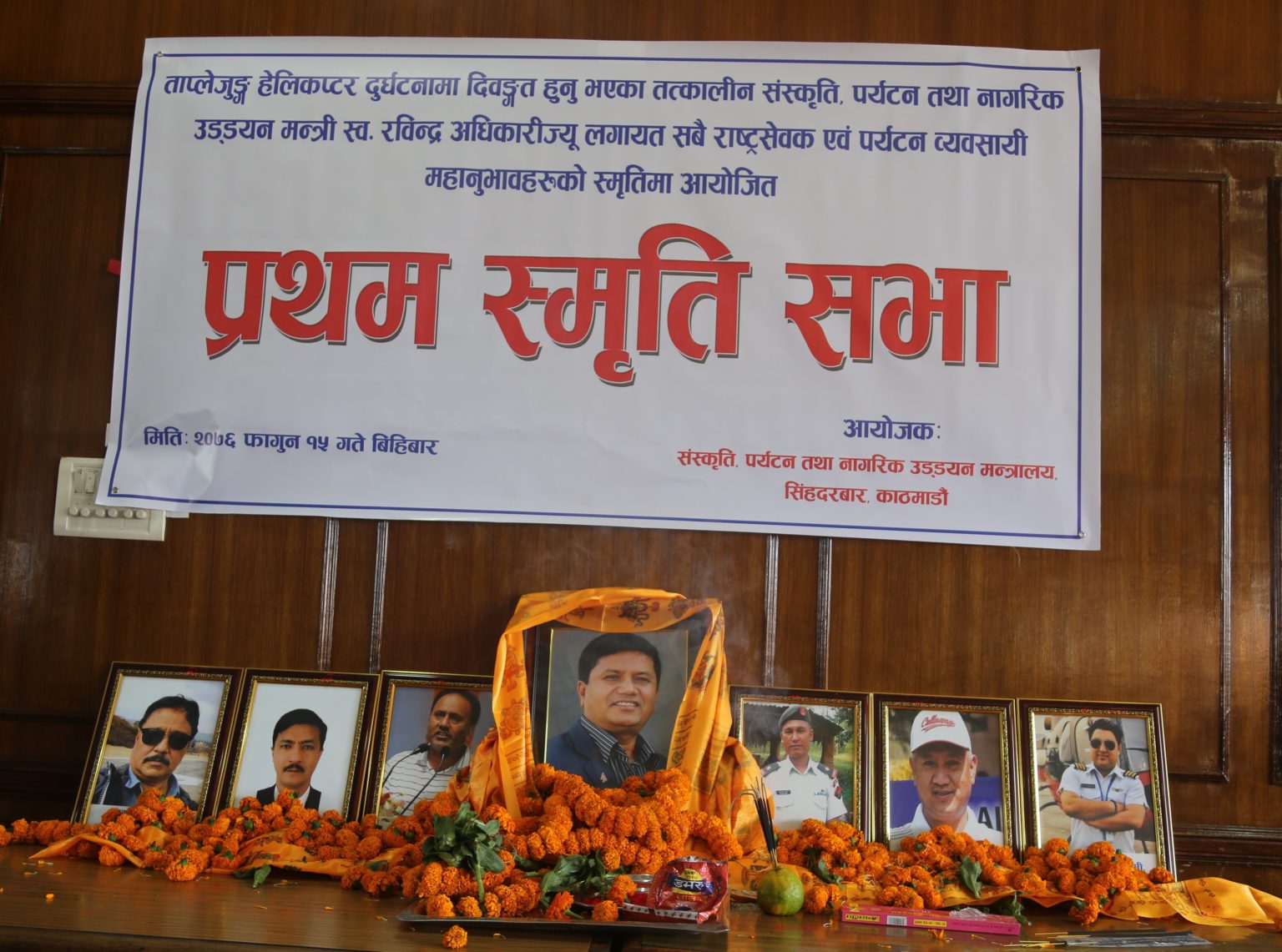 गत फागुन १५ मा ताप्लेजुङ्गमा भएको हेलिकप्टर दुर्घटनामा मन्त्री अधिकारी सहित यति एयरलाइन्सका प्रबन्ध निर्देशक आङछिरिङ शेर्पा, नेपाल नागरिक उड्डयन प्राधिकरणका उपमहानिर्देशक वीरेन्द्रप्रसाद श्रेष्ठ, नेपाल नागरिक उड्डयन प्राधिकरणका निर्देशक ध्रवु भोछिभोया, उपसचिव युवराज दाहाल, पाइलट क्याप्टेन प्रभाकर केसी र नेपाली सेनाका जमदार अर्जुनकुमार घिमिरेको निधन भएको थियो । मन्त्रालयले मन्त्री अधिकारी सहित दुर्घटनामा निधन भएकाहरुको सम्झनामा स्मृति सभाको आयोजना गरेको हो ।
