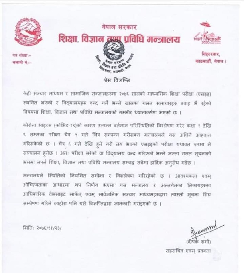 ‘एसइई परीक्षा स्थगित भएको र विद्यालयहरु बन्द भएको भन्ने खालका गलत समाचारहरु प्रवाह रहेको विषयमा मन्त्रालयको गम्भीर ध्यानाकर्षण भएको छ,’ विज्ञप्तीमा उल्लेख छ, ‘चैत छ गतेदेखि हुने गरी तय भएको परीक्षा यथावत रहेको छ।’साथै आवश्यकता अनुसार थप निर्णय भएमा मन्त्रालयले अर्को सूचना निकाल्ने जानकारी पनि दिएको छ।