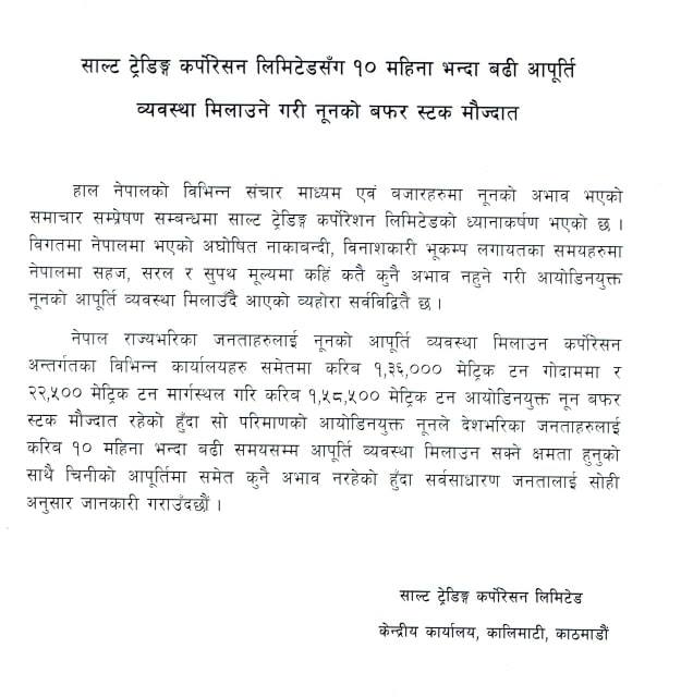 एक सुचना जारी गर्दै ‘साल्ट ट्रेडिङसँग १० महिनाभन्दा बढि आपूर्ति व्यवस्था मिलाउने गरी नूनको बफर स्टक मौज्दात’ रहेको जनाएको हो । ‘विगतमा नेपालमा भएको अघोषित नाकाबन्दी, विनाशकारी भूकम्प लगायतका समयहरुमा नेपालमा सहज, सरल र सुपथ मूल्यमा कहिँ कतै कुनै अभाव नहुने गरी योडिनयुक्त नूनको आपुर्ति व्यवस्था मिलाउँदै आएको व्यहोरा सर्व्िवदितै छ,’ कर्पोरेसनले विज्ञप्ति मार्फत भनेको छ । यता बजारमा कोरोनाको त्राससँगै कालो बजारी सुरु भइसकेको छ ।