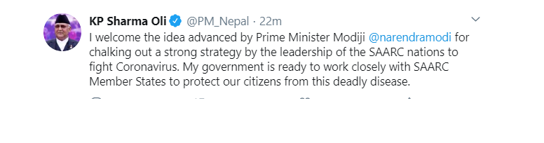 मोदीले कोरोनाभाइरसविरुद्ध लड्न दक्षिणी एसियाली राष्ट्रहरुलाई गरिएको आह्वानप्रति प्रधानमन्त्री ओलीले शुक्रबार ट्वीटमार्फत नै जवाफ फर्काउँदै प्रतिबद्धता जनाएका हुन् ।