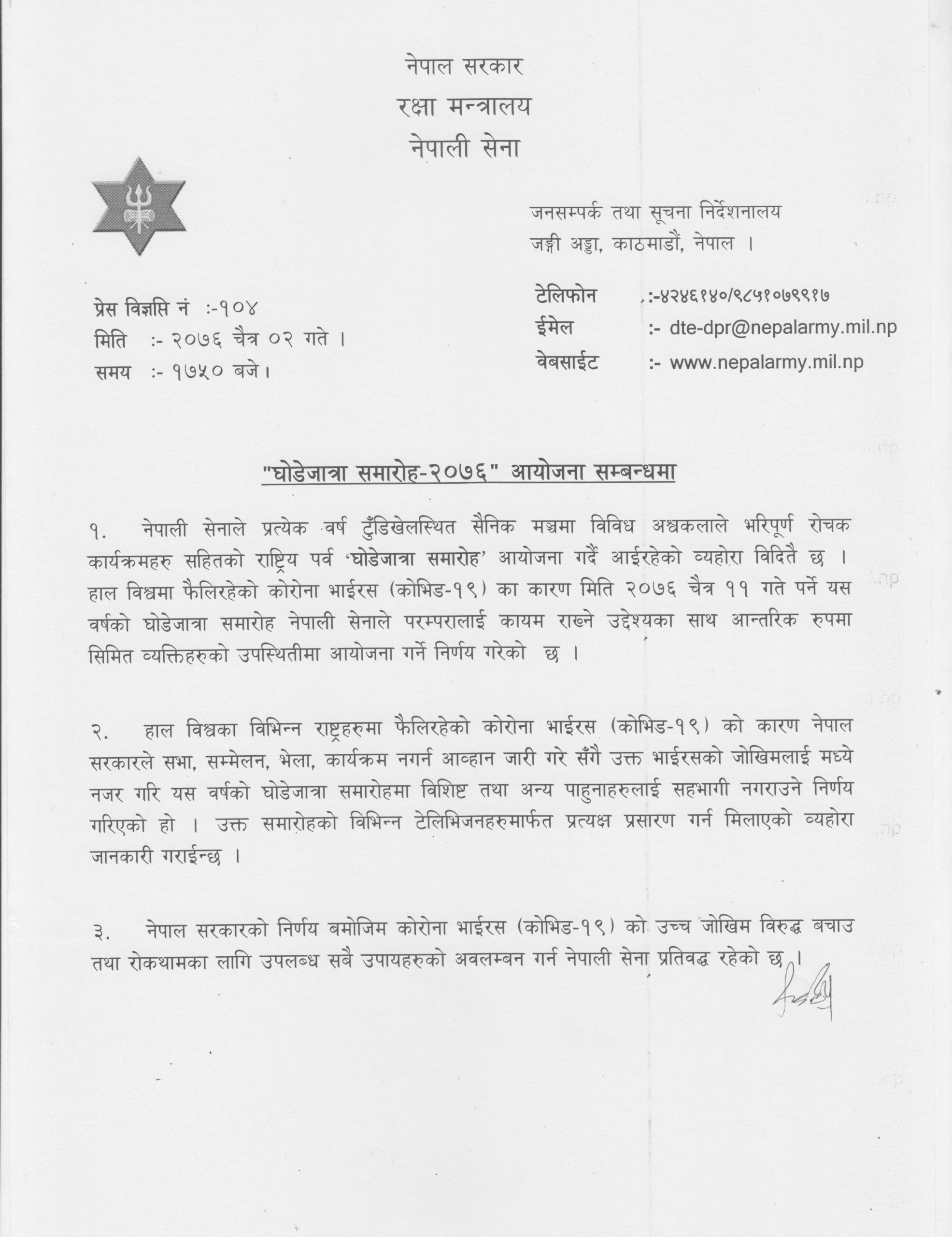 नेपाली सेना जनसम्पर्क तथा सूचना निर्देशनाले सोमबार एक विज्ञप्ति जारी गर्दै हाल विश्वमा फैलिरहेको कोरोना भाईरस (कोभिड –१९) का कारण चैत्र ११ गते पर्ने यस वर्षको घोडेजात्रा समारोह नेपाली सेनाले स्थगित गरेको हो ।