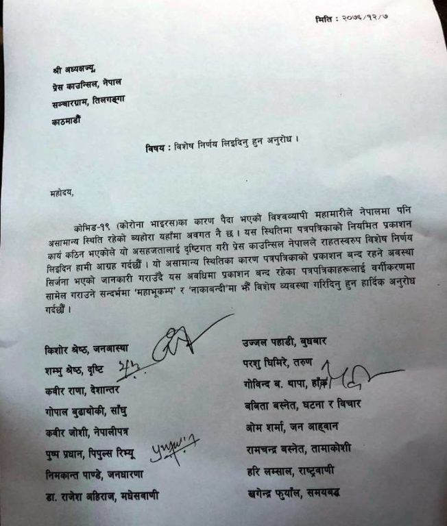 यी पत्रिकाका सम्पादकले प्रेस काउन्सिल नेपाललाई पत्र लेखी नियमित प्रकाशन कठिन भएकाले राहतस्वरुप विशेष निर्णय लिइदिन आग्रह गरेका छन् । उनीहरुले प्रकाशन बन्द रहेका पत्रपत्रिकालाई बर्गीकरणमा सामेल गराउन भूकम्प र नाकाबन्दीमा जस्तै विशेष निर्णय गरिदिन काउन्सिललाई आग्रह गरेका छन् ।
