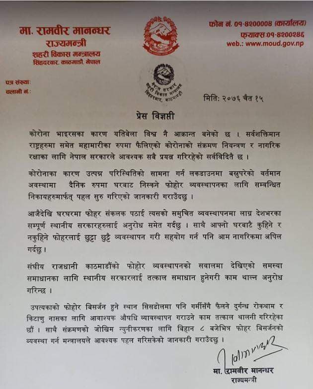 कोरोना भाइरसका कारण उत्पन्न परिस्थितिको सामना गर्नका लागि लकडाउनमा बस्नुपरेको यो अवस्थामा घरबाट निस्कने फोहोर व्यवस्थापनलाई चुस्त बनाउन मन्त्रालयका तर्फबाट पहल सुरु गरिसकिएको विज्ञप्तीमा उल्लेख गरिएको छ ।