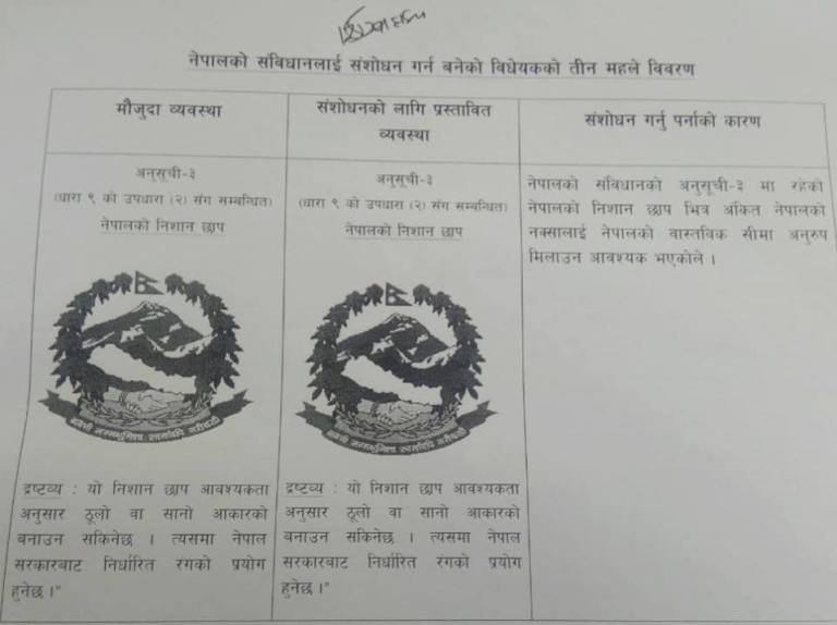 आज बसेको मन्त्रिपरिषद्को बैठकले लिम्पियाधुरा, कालापानी र लिपुलेक क्षेत्रलाई समेटेर हालै जारी गरेको नयाँ नक्साअनुसार संविधानको अनुसूची ३ मा रहेको निशान छाप संशोधनका लागि संविधान संशोधन गर्ने निर्णय गरेको थियो ।