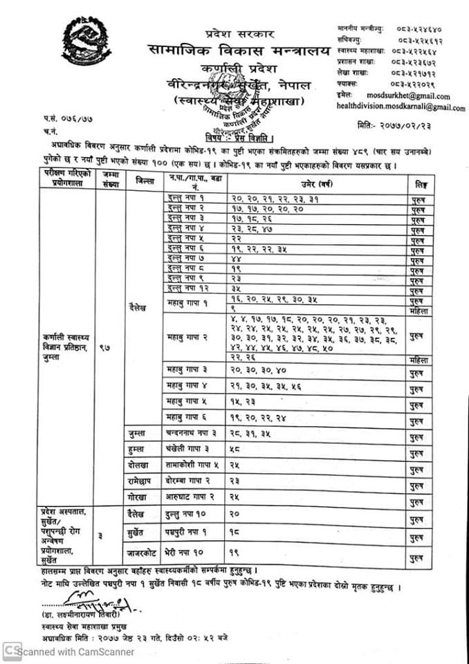 नयाँ संक्रमितहरु दैलेख, जुम्ला, हुम्ला, दोलखा, रामेछाप, गोरखा, सुर्खेत र जाजरकोटका निवासीहरु रहेका छन् ।