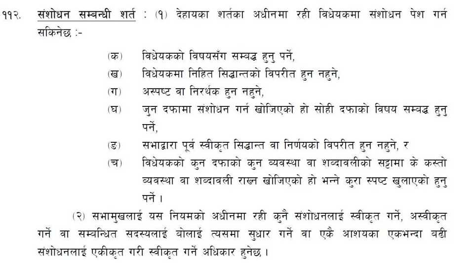 नियमावलीको ११२ ९२० मा लेखिएको छ, ‘सभामुखले यस नियमको अधिनमा रही कुनै संशोधनलाई स्वीकृत गर्ने, अश्वीकृत गर्ने वा सम्बन्धित सदस्यलाई बोलाई त्यसमा सुधार गर्ने वा एकै आशयका एकभन्दा बढी संशोधनलाई एकीकृत गरी स्वीकृत गर्ने अधिकार हुनेछ ।’