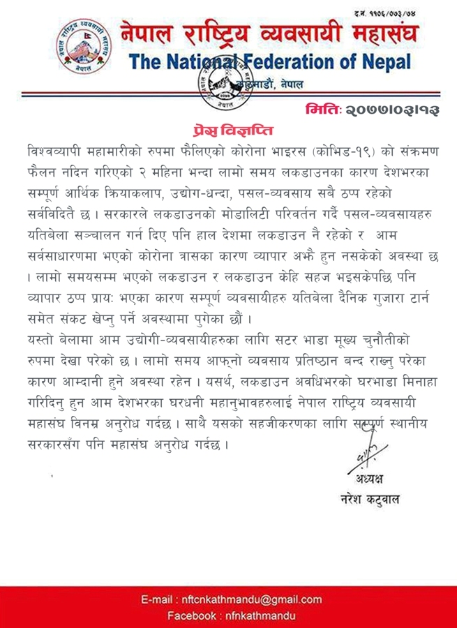 महासंघले यतिबेला व्यवसायीहरु घरभाडा होइन दैनिक गुजारा टार्न पनि समस्यामा परिरहेको जनाएको छ । महासंघका अध्यक्ष नरेश कटुवालले शुक्रबार जारी गरेको विज्ञप्तिमा भनिएको छ, ‘लामो समय लकडाउन भएको र लकडाउन केही सहज भइसकेपछि पनि व्यापार ठप्प प्रायः भएका कारण सम्पूर्ण व्यवसायीहरु यतिबेला दैनिक गुजारा टार्नसमेत संकट खेप्नु पर्ने अवस्थामा पुगेका छौं ।’