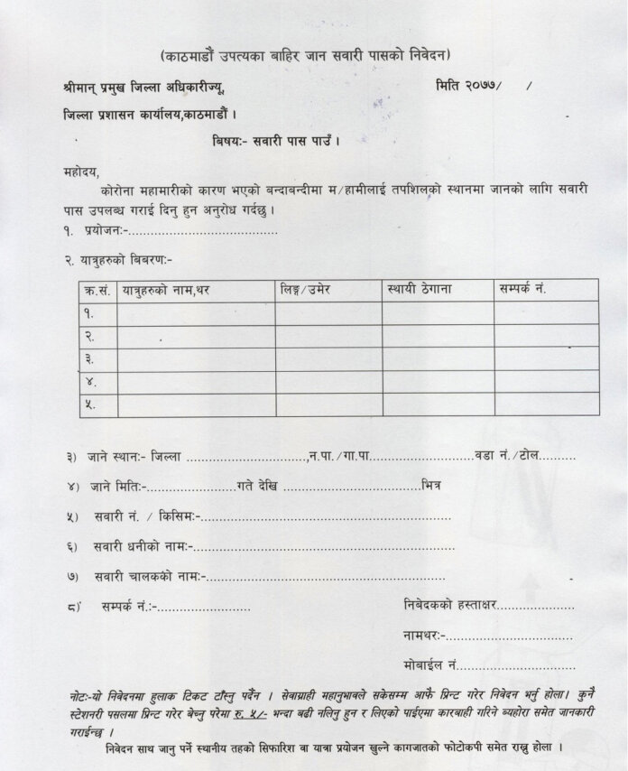 काठमाडौं , असार १४ । काठमाडौं उपत्यका बाहिर जान लिनुपर्ने सवारी पासको ढाँचा सार्वजनिक भएको छ । जिल्ला प्रशासन कार्यालय काठमाडौंले सवारी पासको ढाँचा सार्वजनिक गरेको हो । सवारी पास पाउन अबदेखि निवेदकले कार्यालयले जारी गरेको ढाँचाअनुसार निवेदन दिनुपर्ने छ ।