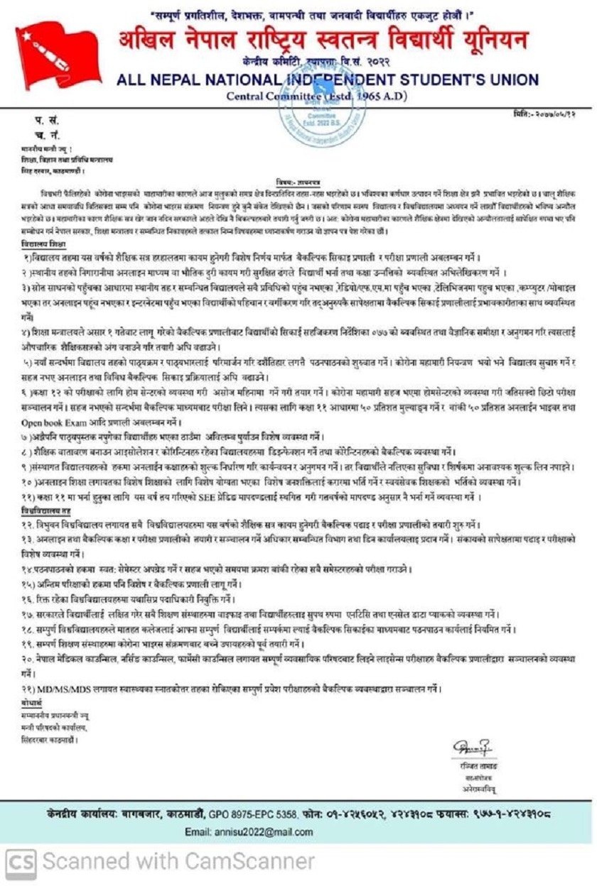 ज्ञापनपत्रमा अनेरास्ववियूले शैक्षिकसत्र कुनै हरहालतमा खेर जान नदिन , वैकल्पिक माध्यमबाट परीक्षा लिन र सिकाई सहजिकरण निर्देशिका ०७७ को समीक्षा र अनुगमन गरि त्यसलाई शैक्षिक सत्रकै अङ्ग वनाउन माग गरेको छ । त्यसैगरी कक्षा ११ मा भर्ना हुनुका लागि यस वर्ष तय गरिएको ग्रेडिङ मापदण्डलाई स्थगित गरी गतवर्षको मापदण्ड अनुसार नै भर्ना गर्ने अनेरास्ववियूले माग गरेको छ ।