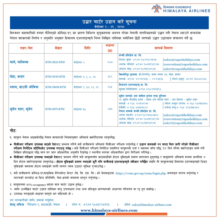विश्वभर कोरोना महामारीको रुपमा फैलिएको कोभिड–१९का कारण विभिन्न मुलुकहरुमा अलपत्र नेपाली नागरिकहरुको उद्धार गरी नेपाल ल्याउन नेपाल सरकारको निर्णय र अनुमतिअनुसार हिमालय एयरको उडान संचालन हुँदै आइरहेको छ । हिमालय एयरलाइन्सले यसअघि पनि विभिन्न देशहरुबाट चार्टर्ड उडान गरिरहेको छ ।