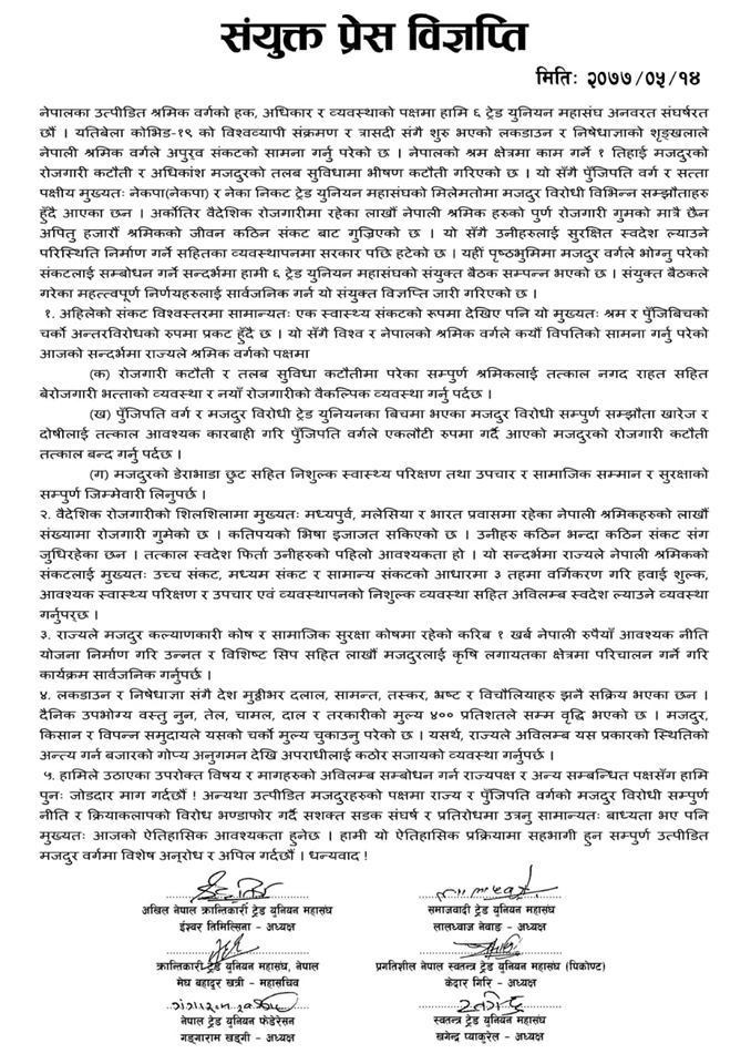 आइतबार जारी गरिएको विज्ञप्तिमा राज्यले उत्पीडित मजदुरहरूको संकटलाई सम्बोधन गर्न आवश्यक पहल नगरेको भन्दै राज्यलाई जिम्मेवार भएर मजदुर वर्गको संकटलाई अविलम्ब सम्बोधन गर्न माग गर्दै विज्ञप्तिमा उल्लेख गरिएको छ, “यतिबेला कोभिड-१९ को विश्वव्यापी संक्रमण र त्रासदीसँगै सुरु भएको लकडाउन र निषेधाज्ञाको शृङ्खलाले नेपाली श्रमिक वर्गले अपुर्व संकटको सामना गर्नु परेको छ । नेपालको श्रम क्षेत्रमा काम गर्ने १ तिहाई मजदुरको रोजगारी कटौती र अधिकांश मजदुरको तलब सुविधामा भीषण कटौती गरिएको छ ।