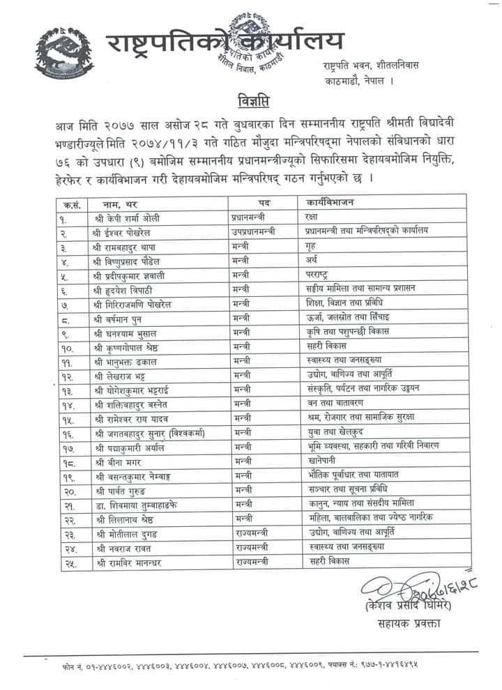 उनको पद खोसिएसँगै रक्षा मन्त्रालय प्रधानमन्त्री आफैले राखेका छन् । यस्तै ओली सरकारमा ३ नयाँ अनुहारले प्रवेश पाएको छ । जसमा महासचिव विष्णु पौडेलले अर्थ, नेता कृष्णगोपाल श्रेष्ठले सहरी विकास र लिलानाथ श्रेष्ठ महिला बालबालिका तथा जेष्ठ नागरिकको मन्त्री बनेका छन् ।