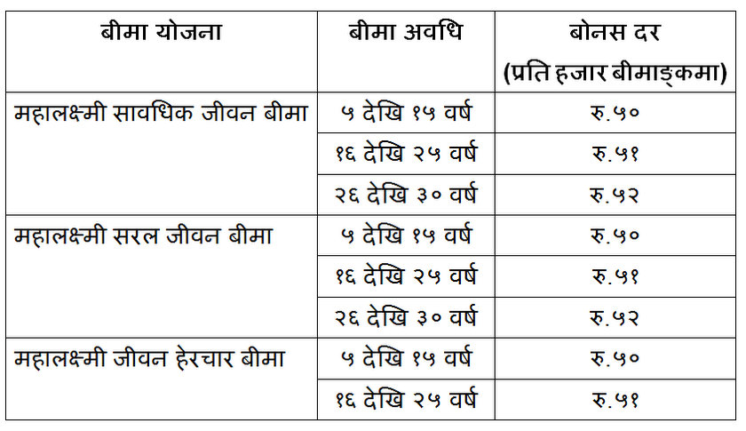 बीमा समितिको मिति कार्तिक २८ गते को पत्रबाट स्विकृति प्राप्त भए बमोजिम कम्पनीले संचालनमा ल्याएको तथा मूनाफामा सरिक हुने महालक्ष्मी सावधिक, महालक्ष्मी सरल र महालक्ष्मी जीवन हेरचार बीमाको २०७५र ७६ को लागि न्यूनतम रु.५० प्रतिहजारको दरले बोनस घोषणा गरिएको हो।
