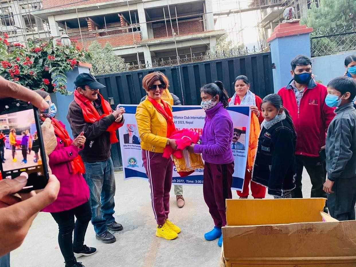बढ्दै गएको चिसोलाई मध्यनजर गर्दै बच्चाहरुलाई जोडोबाट बचाउनका निम्ति क्लबले गत बुधबार यस एलायन्स क्लब अफ काठमाडौं सिटिका क्लब चार्टर प्रेसिडेन्ट भिकेएस ठकुरीले चिल्ड्रेन वलफेयरका अध्यक्ष जयराम टमाटा मार्फत १५ जना बालबालिकाहरुलाई सेट सहितको न्यानो कपडा वितरण गरेको हो ।