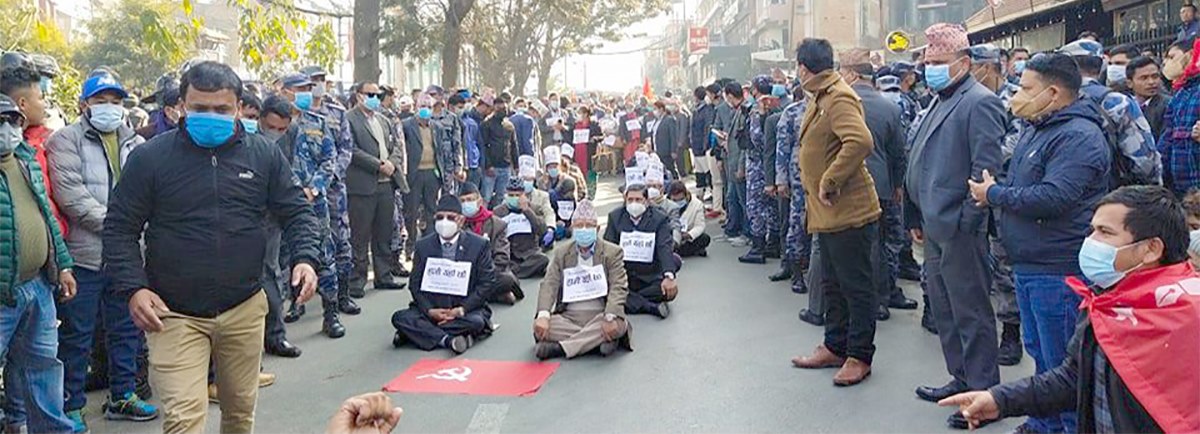 यता यसरी नेकपा विभाजित भएपछि अहिले प्रचण्ड–नेपाल समूह आन्दोलनमा होमीएको छ । ओलीविरुद्ध हिजो मात्रै आन्दोलनका कार्यक्रम घोणषा गरेको हो । आन्दोलनको कार्यक्रम अन्तरगत शुक्रबार माइतीघरमा शीर्ष नेतासहित केन्द्रीय सदस्यहरुले धर्ना दिए । धर्ना दिने क्रममा सडकमै बसेर प्रचण्ड , नेपाल लगायतले ‘हामी यहाँ छौं’ प्लेकार्ड छातीमा टाँस गरि धर्ना दिएको तस्बिर सार्वजनिक भयो ।