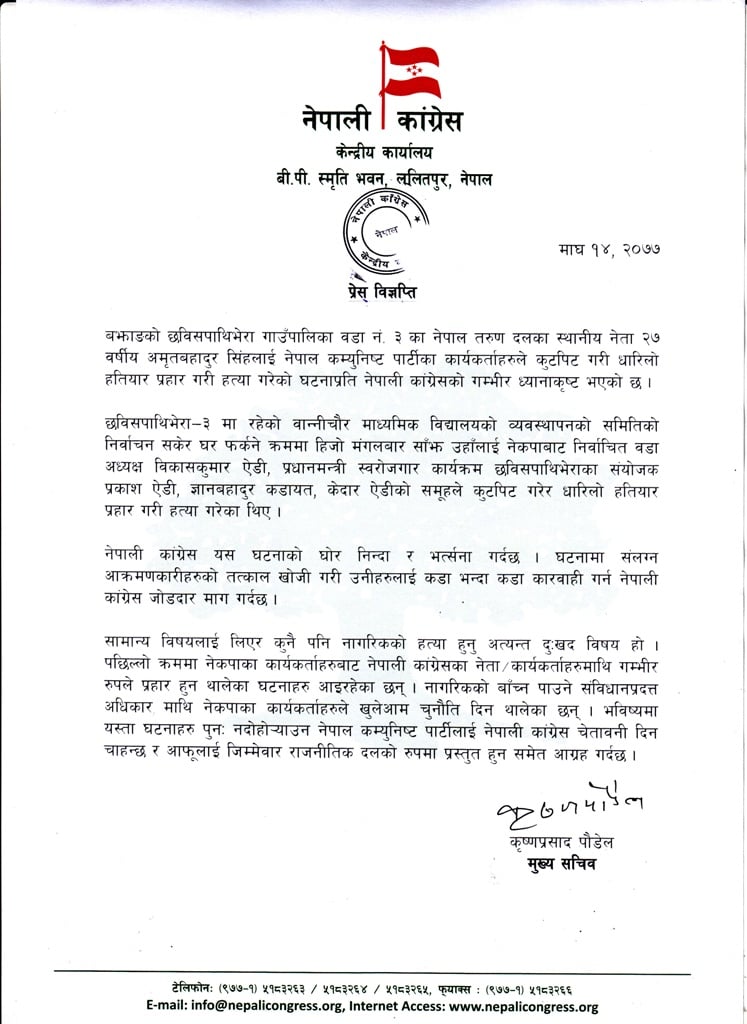 सिंहमाथि खुँडा प्रहार गरी हत्या गर्ने नेपाल कम्युनिष्ट पार्टीका कार्यकर्तालाई कडा कारबाही गर्न कांग्रेसले माग गरेको हो।स्थानीय विद्यालयको व्यवस्थापनको समितिको निर्वाचन सकेर घर फर्कंने क्रममा मंगलबार साँझ उनलाई खुँडा प्रहार गरि हत्या गरिएको हो ।