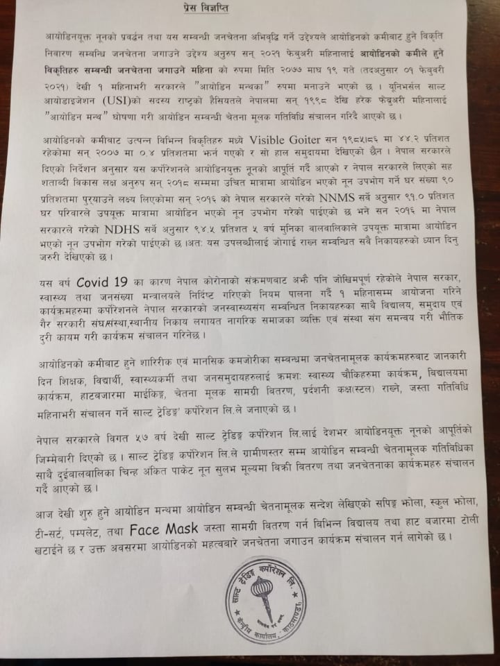 आयोडिनयूूक्त नूनको प्रर्वद्धन तथा यस सम्वन्धी जनचेतना अभिबृद्धि गर्ने उद्देश्यले आयोडिनको कमीवाट हुने विकृति निवारण सम्बन्धि जनचेतना जगाउने उद्देश्य अनुरुप २०७७ माघ १९ गते (तदअनुसार )१ फेब्रुअरी २०२१ देखि १ महिनाभरी सरकारले ‘आयोडिन मन्थ’का रुपमा मनाउने भएको हो ।
