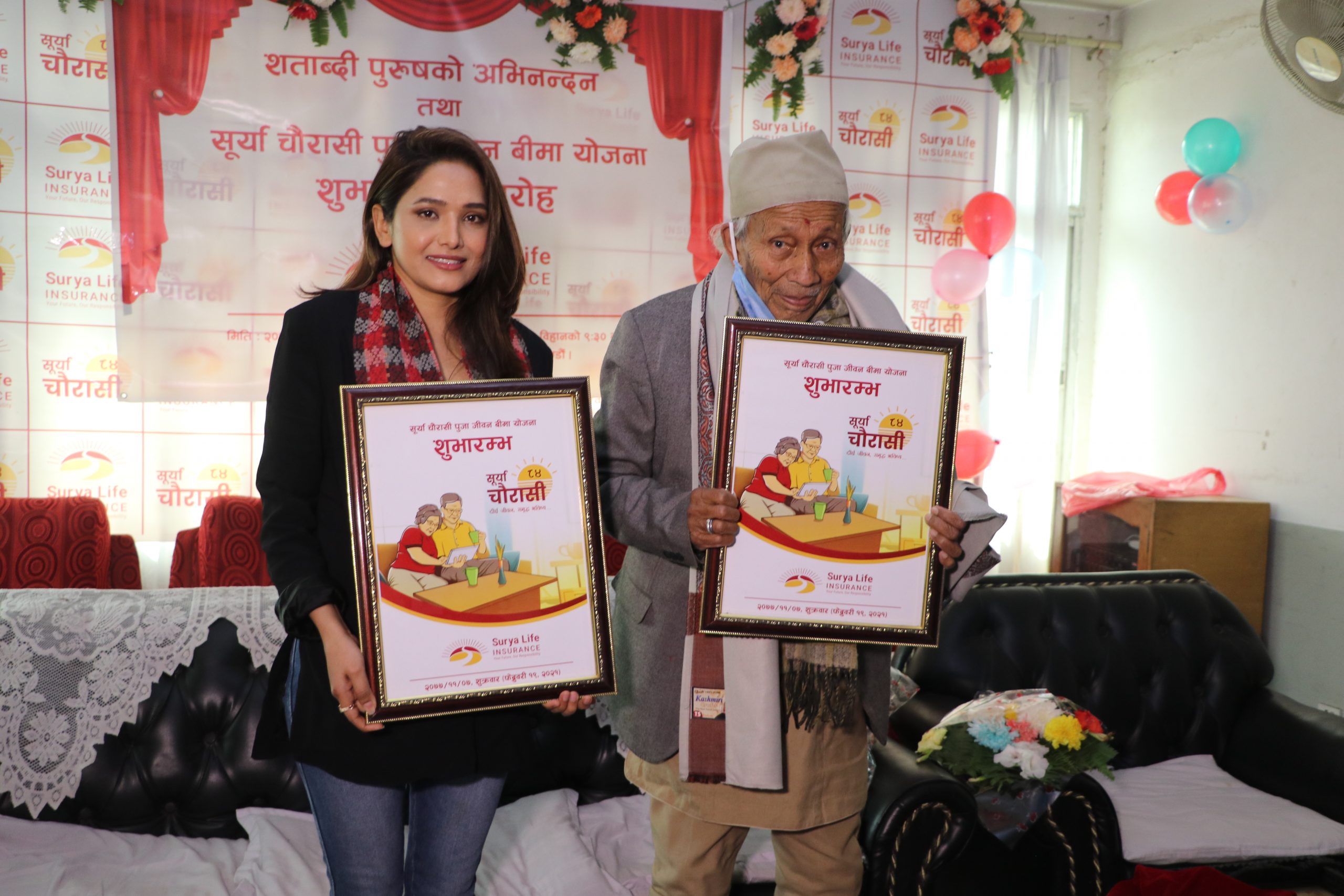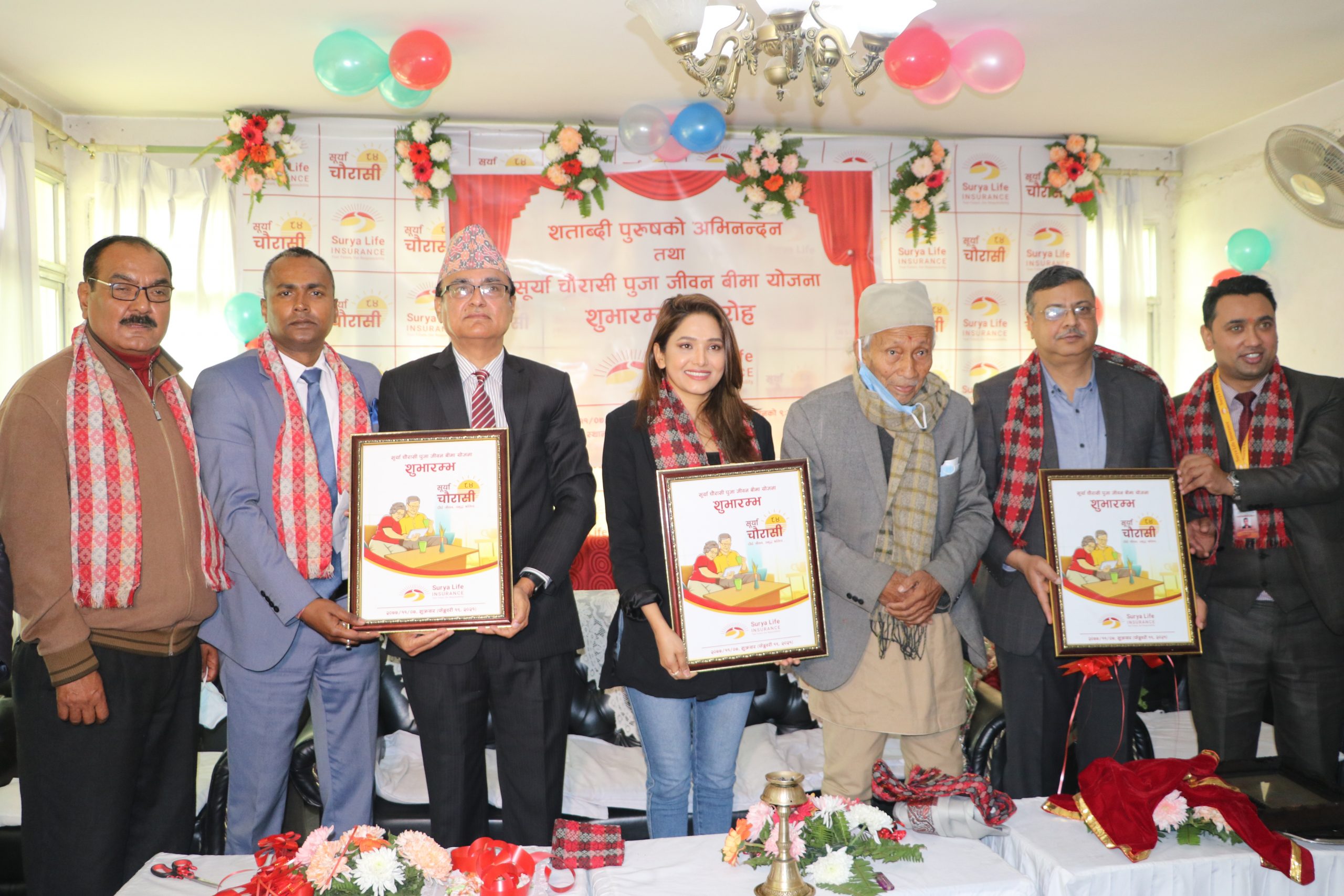 शताब्दी पुरुष सत्यमोहन जोशीको प्रमुख आतिथ्यमा सम्पन्न कार्यक्रम शताब्दी पुरुष सत्यमोहन जोशी, कम्पनीका ब्रान्ड एम्बेसडर गायिका इन्दिरा जोशि, कम्पनीका संस्थापक शेयरधनी विवेक झा, कम्पनीका अध्यक्ष केशब प्रसाद भट्टराईले संयुक्त रुपमा सूर्या चौरासी पुजा बीमा योजनाको अनावरण गर्नु भएको थियो ।