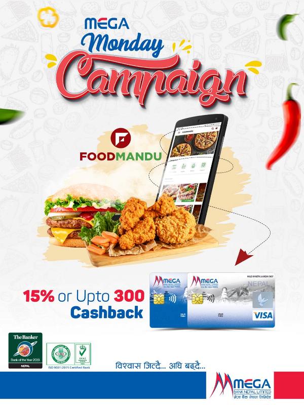 फुण्डमाण्डूसँगको सहकार्यमा ‘मेगा मण्डे’ नामक अभियानको संचालन गर्दै मेगा बैंकले हरेक सोमबार १५ प्रतिशत छुट अथवा ३ सय रुपैंयासम्मको ‘क्यासब्याक’ अफर ल्याएको छ । यस अभियान अन्तरगत मेगा बैंकको डेबिट तथा क्रेडिट कार्ड प्रयोगकर्ताले फूडमाण्डूको एप्स प्रयोग गरी रकम भुक्तानी गर्नुपर्नेछ ।