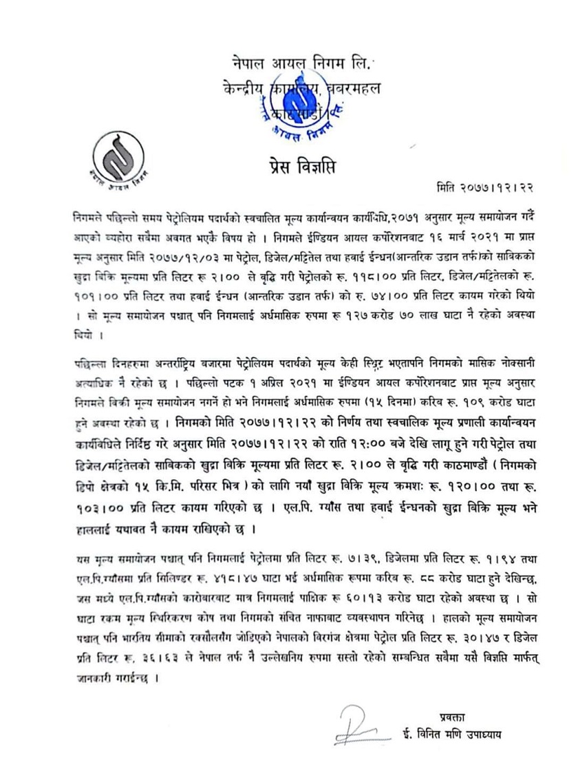 काठमाडौं, २३ चैत । नेपाल आयल निगमले पेट्रोलियम पदार्थको मूल्यमा फेरी वृद्धि गरेको छ । यसले गर्दाउपभोक्ता मारमा परेको छ । निगमले मंगलबार राति १२ बजेबाट लागू हुनेगरी पेट्रोल, डिजेल र मट्टितेलमा २–२ रुपैयाँका दरले मूल्य वृद्धि गरेको छ । योसँगै पेट्रोल प्रतिलिटर १२० रुपैयाँ पुगेको छ भने डिजेल र मट्टितेल १०३ रुपैयाँ पुगेको छ । निगमले हवाई इन्धन र ग्यासको मूल्य भने उहि नै राखिएको जानकारी दिएको छ । गत चैत ३ गते पनि निगमले मूल्य बढाएको थियो । निगमले प्रत्येक पटक पेट्रोलमा मुल्य वृसद्ध गर्दै आएको छ ।
