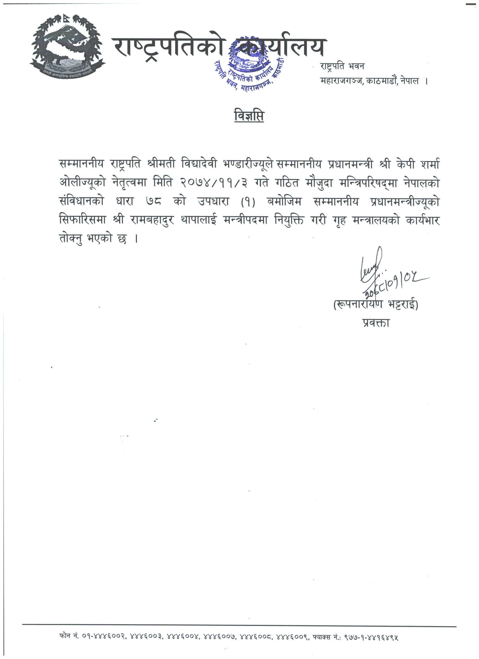 काठमाडौं , बैशाख ५ । राष्ट्रपति विद्यादेवी भण्डारीले नेकपा (एमाले) का नेता रामबहादुर थापालाई गृह मन्त्रीमा पुनः नियुक्त गरेकी छिन् ।