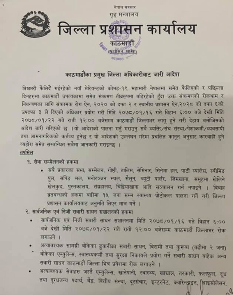 काठमाडौँ , बैशाख १३ । जिल्ला प्रशासन कार्यालय काठमाडौँले विहिबार बिहान ६ बजेदेखि बैशाख २२ गते बुधबार रति १२ बजेसम्म काठमाडौँ जिल्लाभर यातायात बन्द गर्ने आदेश जारी गरेको छ ।